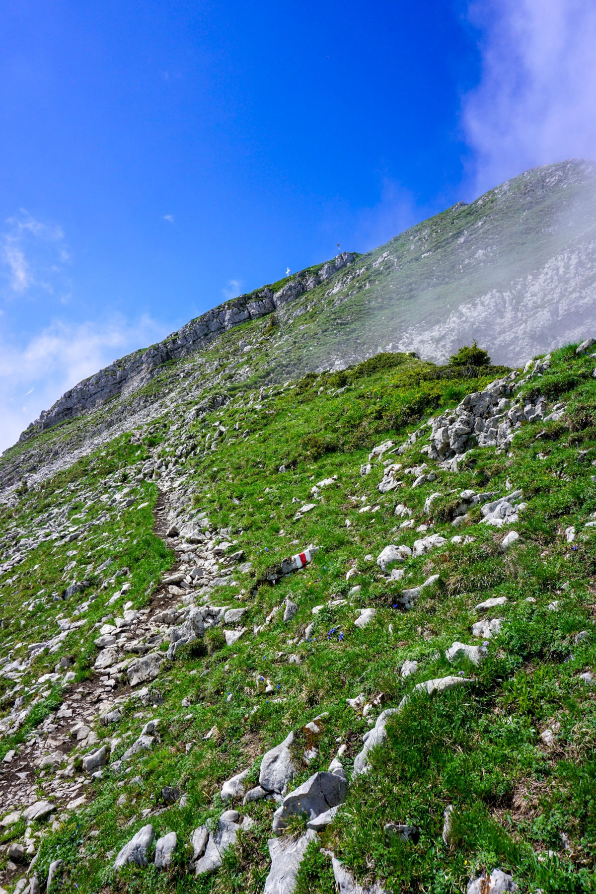 From the hut, the real climbing begins, and you have the choice of either following the alpine trail (marked in white-blue-white) or the mountain trail. Both are steep and sometimes you must overcome a few rocky sections. In our case, we chose the mountain trail. This leads to a small mountain pass to the north of the summit. From here, it becomes a bit more exposed, as you follow the crest. Unfortunately, in our case, clouds had started to form over the north-western side of the range, blocking the view of Schangnau and Marbachegg.
