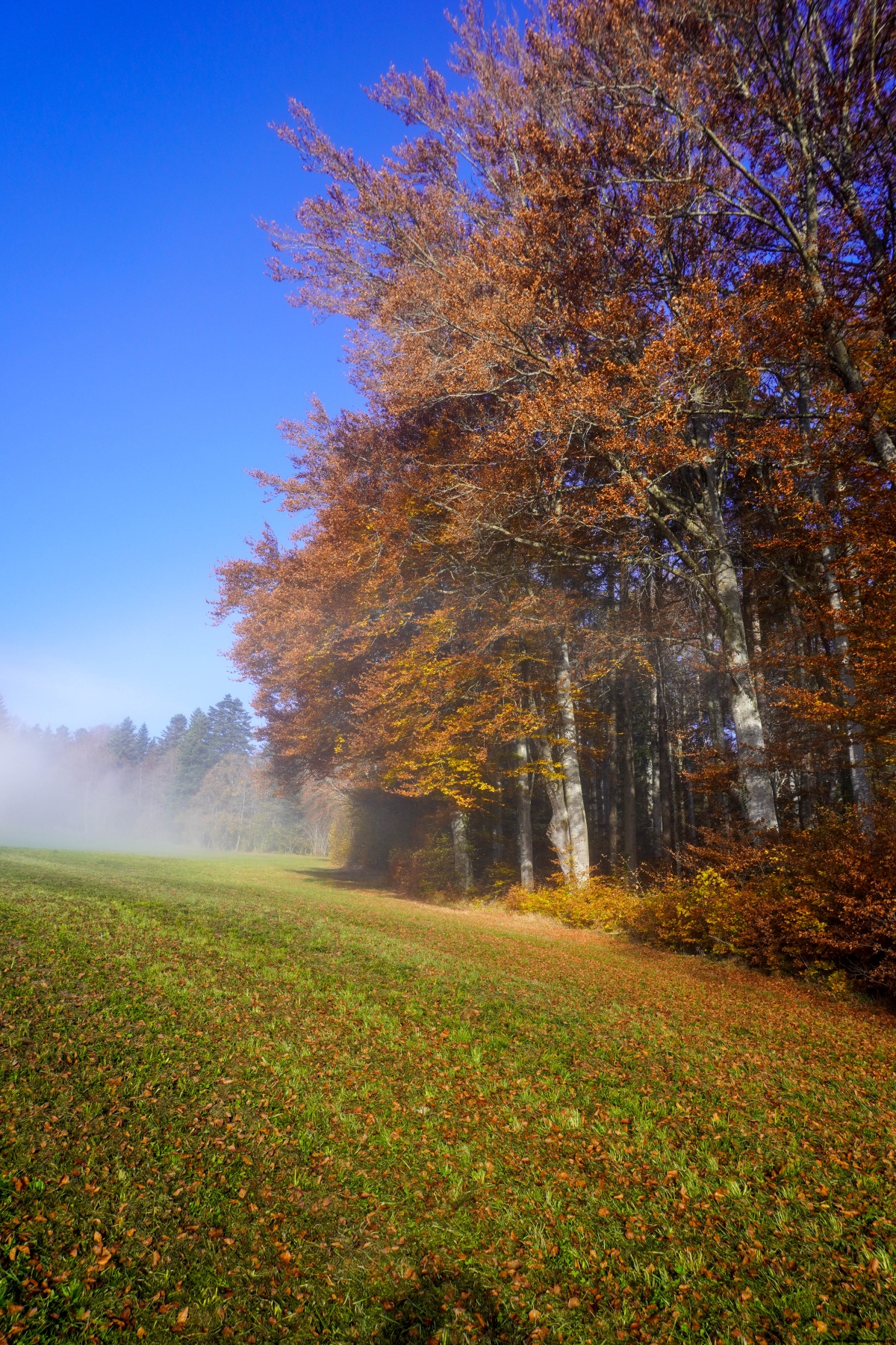Après la Hohmatt, nous sommes montés encore un peu pour rejoindre la Waldhütte, également régie par Haute Ecole de Sports. Nous y avions fêté quelques événements. Plus loin, le chemin devient beaucoup plus plat et, au sortir de la forêt, descend en pente douce en direction de Lamboing. C’est dans la descente que nous avions eu la déception de constater que le sommet du stratus était désormais bien plus haut qu’annoncé. Néanmoins, nous avions continué à descendre en direction du petit vallon du Twannbach.